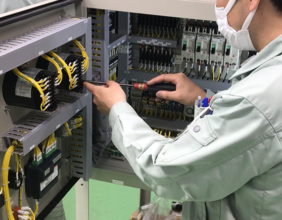 配線の接続が回路図通りに処置されているか、美観よく配線が整えられているか、規定のトルク値でのネジの締め付けが実施されているか、配線の電気的特性などに配慮されているかなど、多岐にわたる項目をチェックし、厳格な品質管理を実施します。